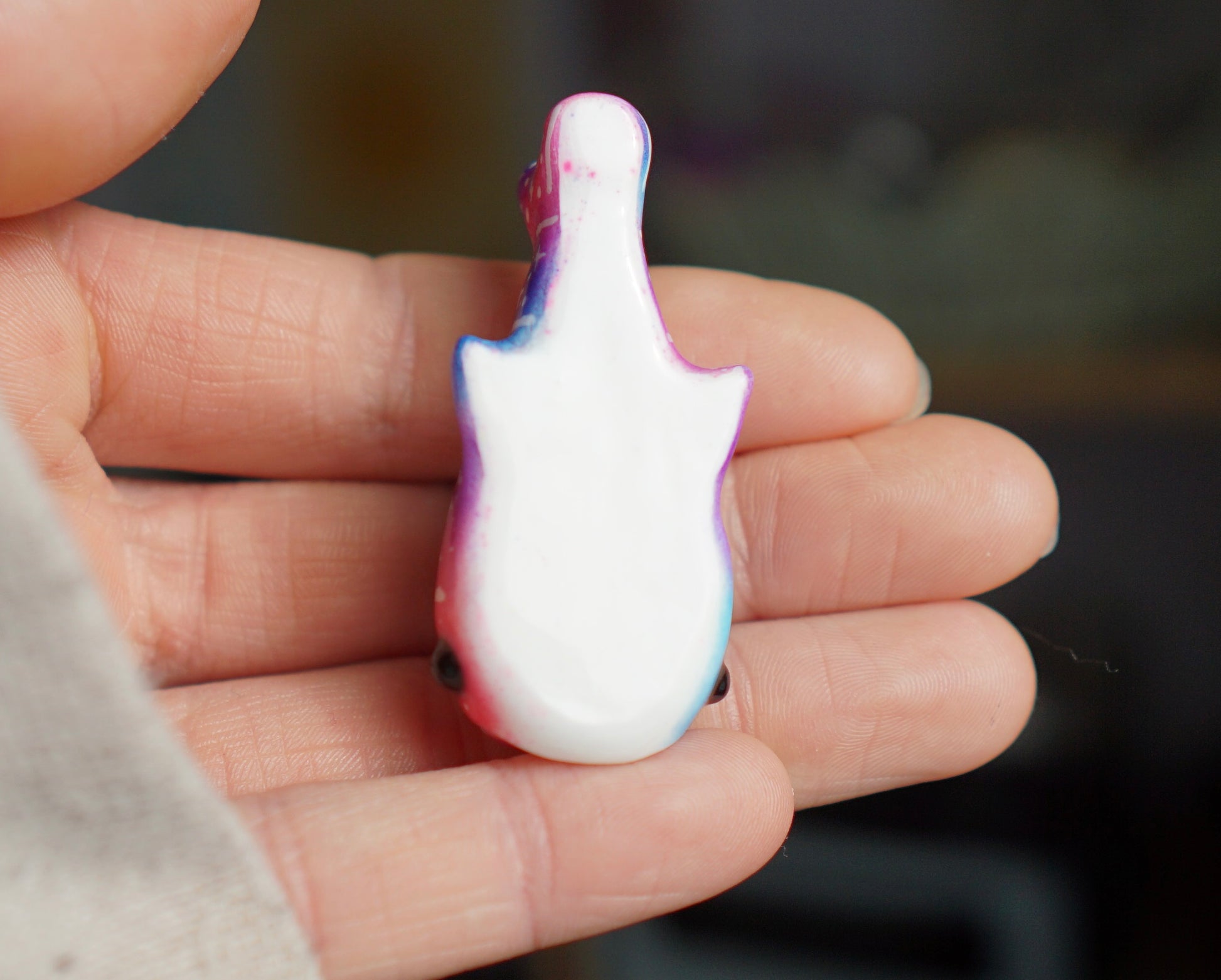 This piece is handmade using polymer clay and cured through baking. The markings are hand-painted with acrylic paint, then finished with a layer of UV resin to add shine and protection.