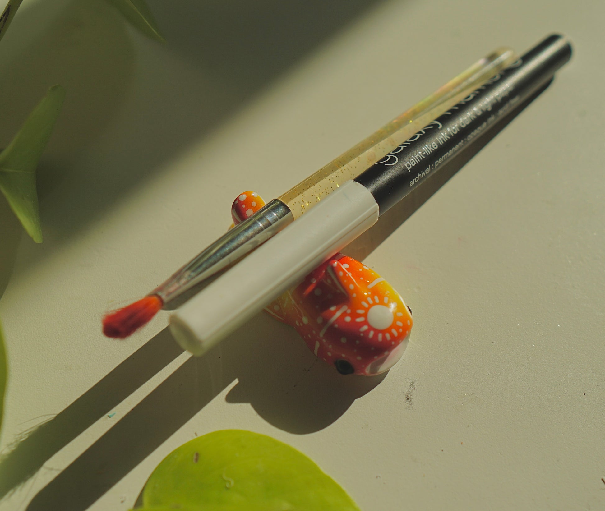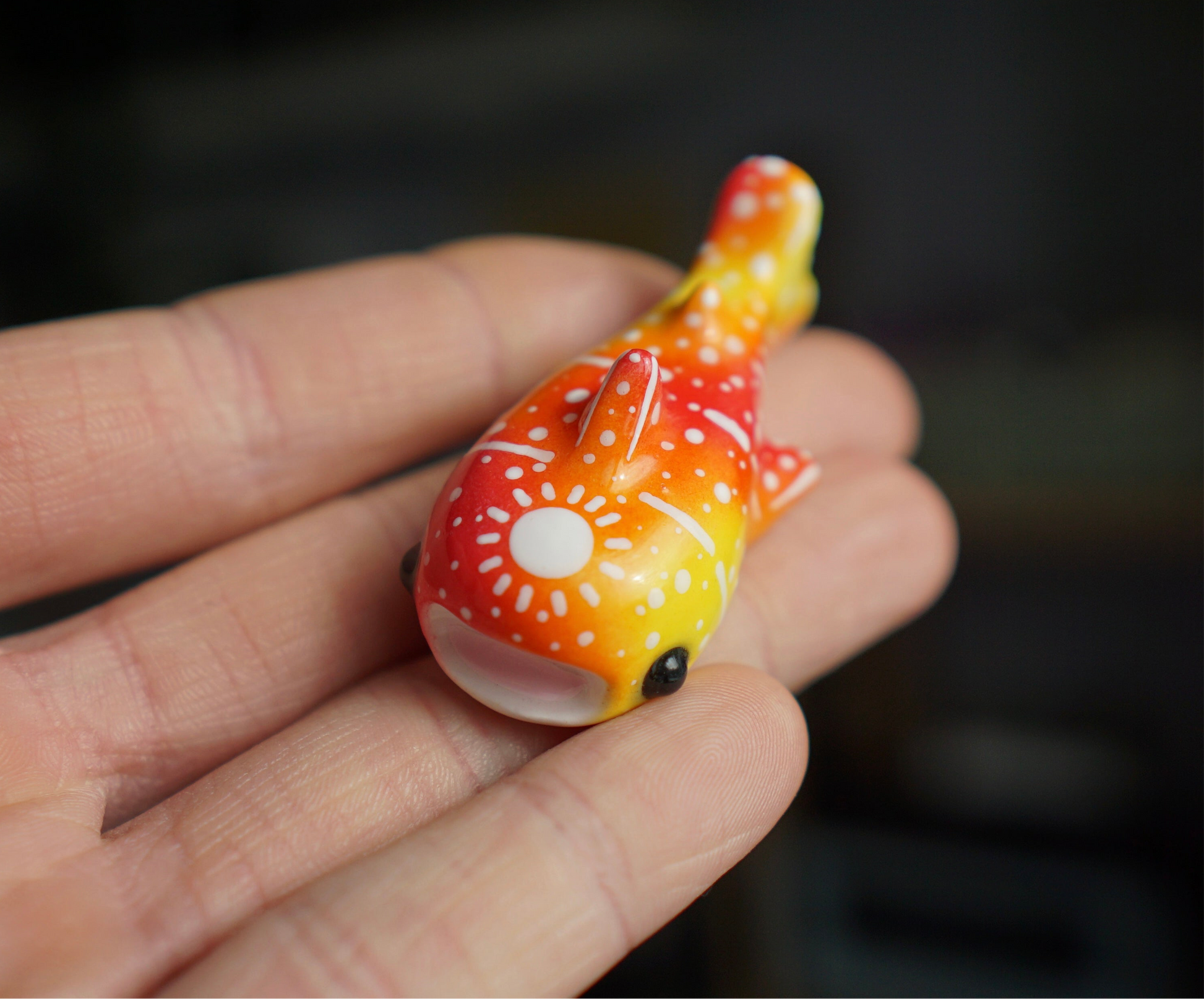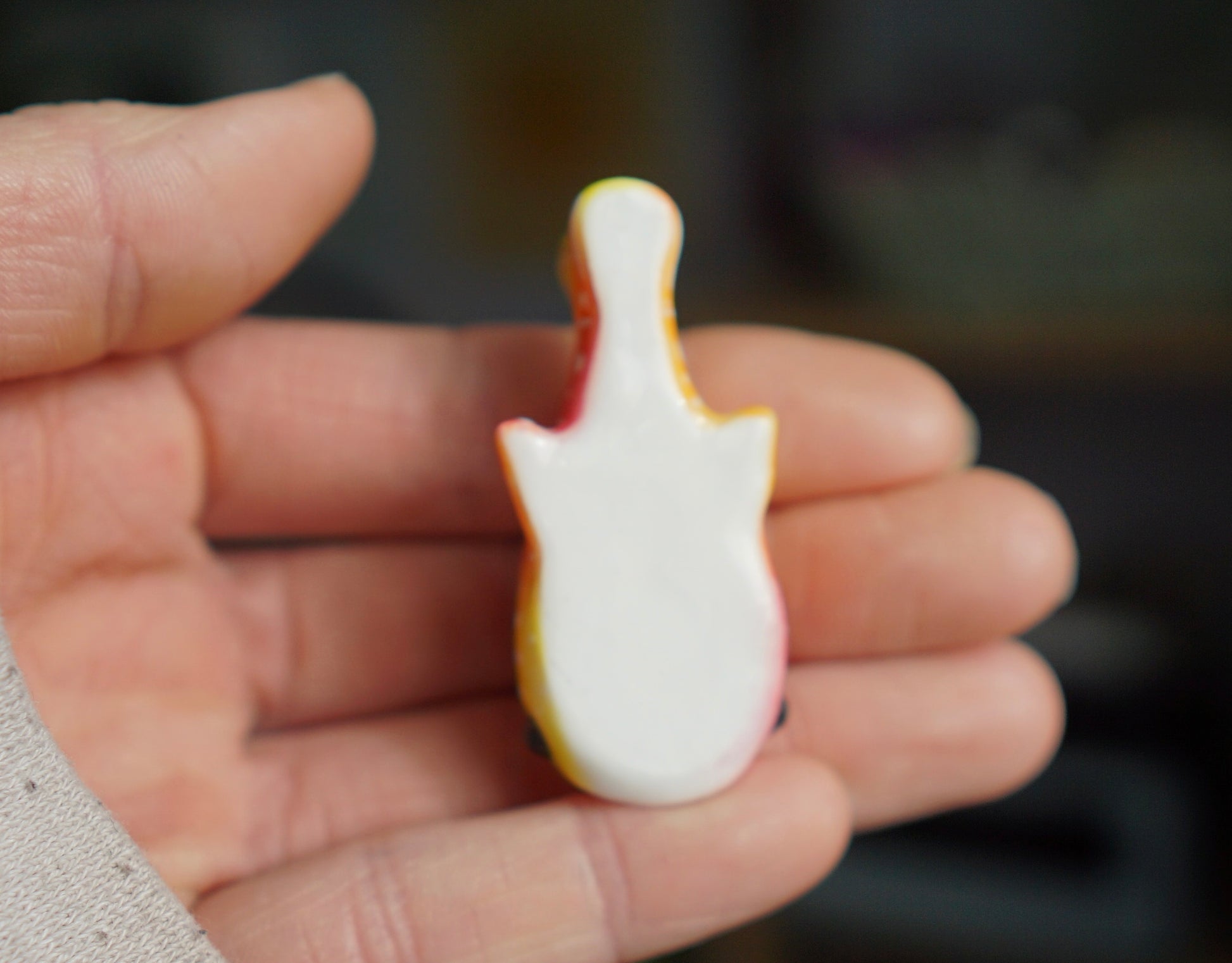 This piece is handmade using polymer clay and cured through baking. The markings are hand-painted with acrylic paint, then finished with a layer of UV resin to add shine and protection.